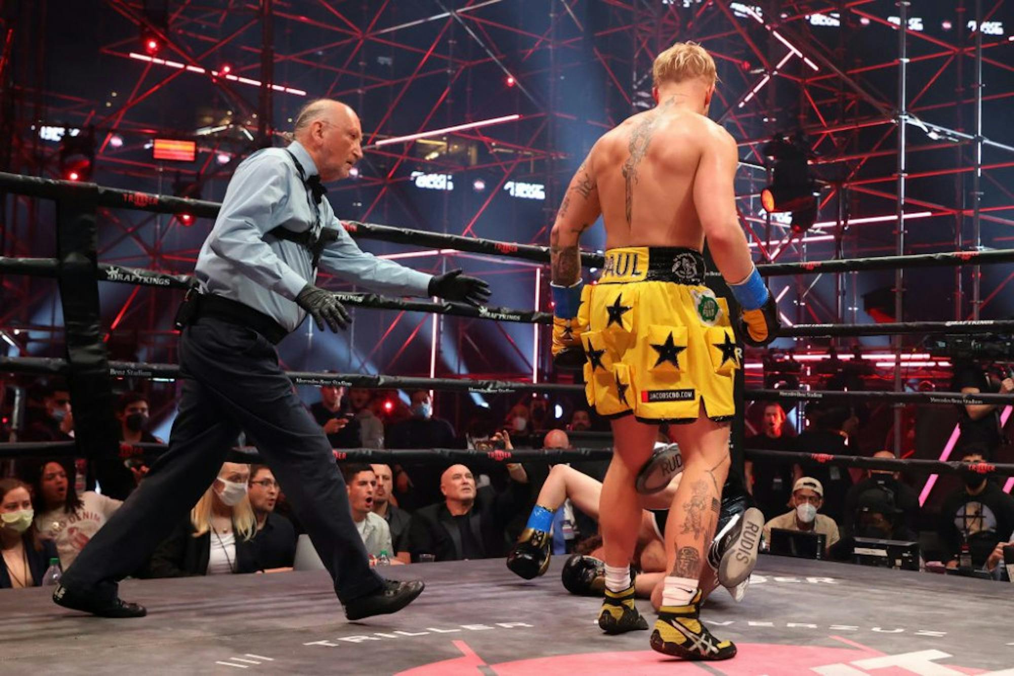 The performances and spectacle led up to the main event of the night between Paul and Askren. Askren walked into the ring first led by “Dude with Sign” doing just as his name says. Paul, known for his over-the-top antics, was led into the ring by his mascot The Problem Bot, an overly-sized robot nicknamed after Paul, who goes by “The PRBLM Child.” The boxers settled into their corners of the ring and their teams gave them last minute advice.