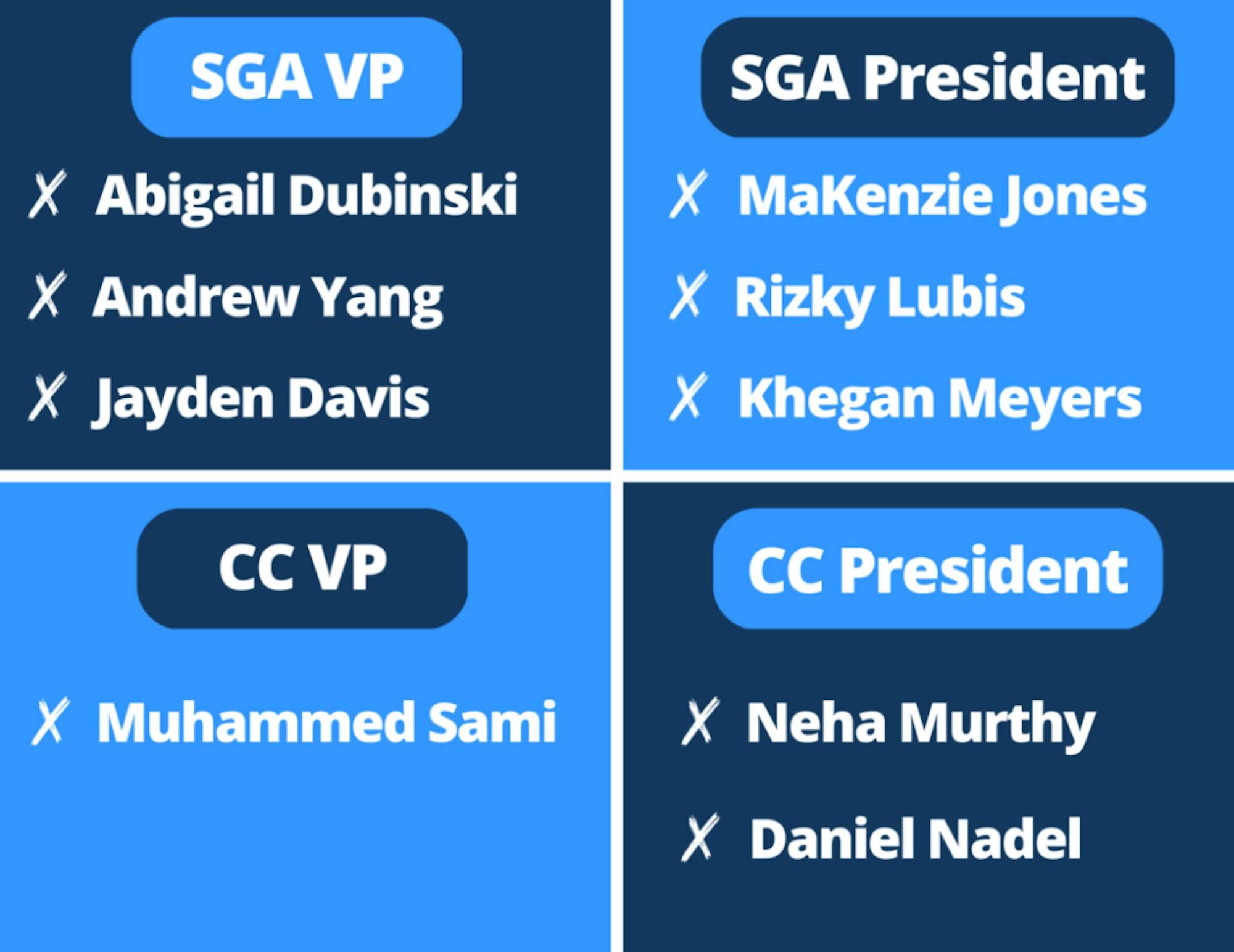 Update (2/15/23 at 10:34 p.m.): A previous version of this article stated that BBA SGA vice president was one of the positions in the election. In fact, the position is BBA SGA representative. Additionally, the previous version stated that College Council Fourth Year Legislator Candidate Orion Jones' graduation year as 25C. In fact, his year is 24C. Lastly, the article misspelled the names of candidates as Muhammed Sami (25C), Taimin Lao (26C), Sophie Kalman (26C), Matthew Veersasammy (26C) and Ankita Archarya (22Ox, 25C). In fact, their names are spelled Muhammad Sami, Taimin Liao, Sophie Kalmin, Matthew Veerasammy and Ankita Acharya, respectively.