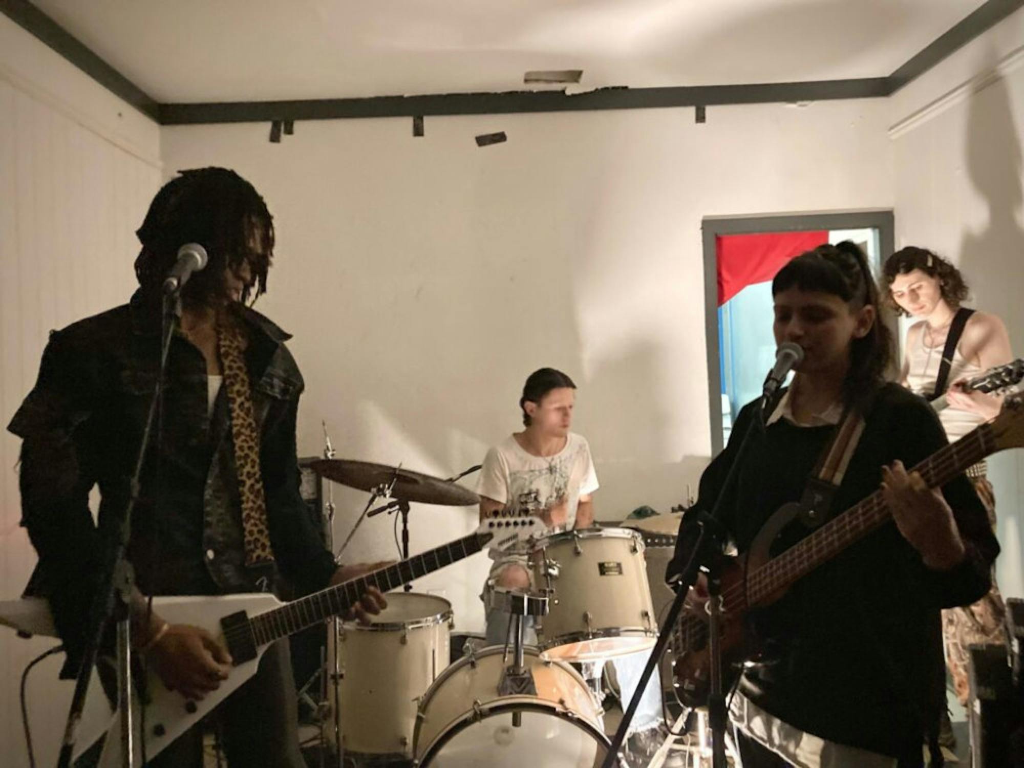 Framed by the silver shadows of phone flashlights and lamps, the band begins soundcheck. Streetlights glint through the window. Soon, the music pulsates above the band with dizzying momentum, as the crowd moshes in the dark on the checkered floor. Everyone’s striving to lose control, reaching fervently for that moment of split-second catharsis. As the drums and clattering instrumentals grow louder, the vocals hum in the background — a tether for the storm spinning outward.