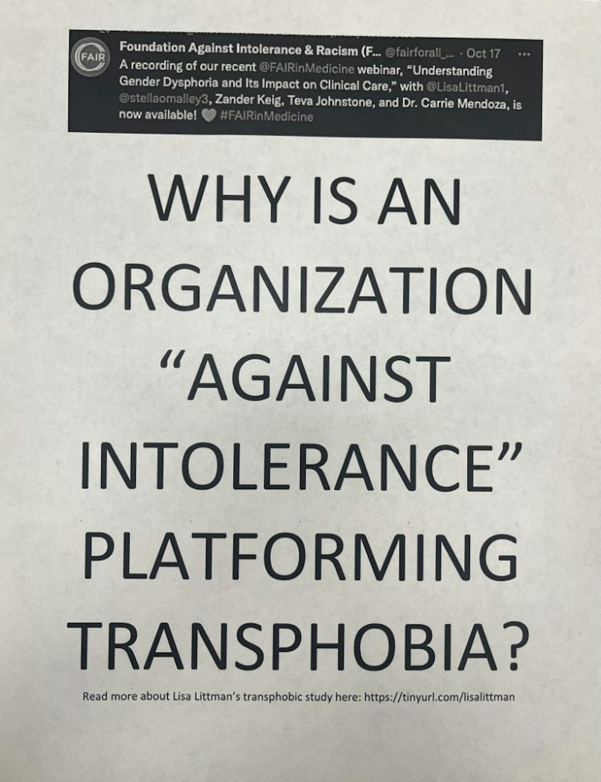 Alex Klein (24L), who declined to confirm if they put up the fliers, was among FAIR’s critics. They alleged that FAIR gives a platform to transphobia, noting the organization’s webinar “Understanding Gender Dysphoria and Its Impact on Clinical Care.” FAIR promoted the event in an Oct. 17 tweet, which was featured on an opposing flier.
