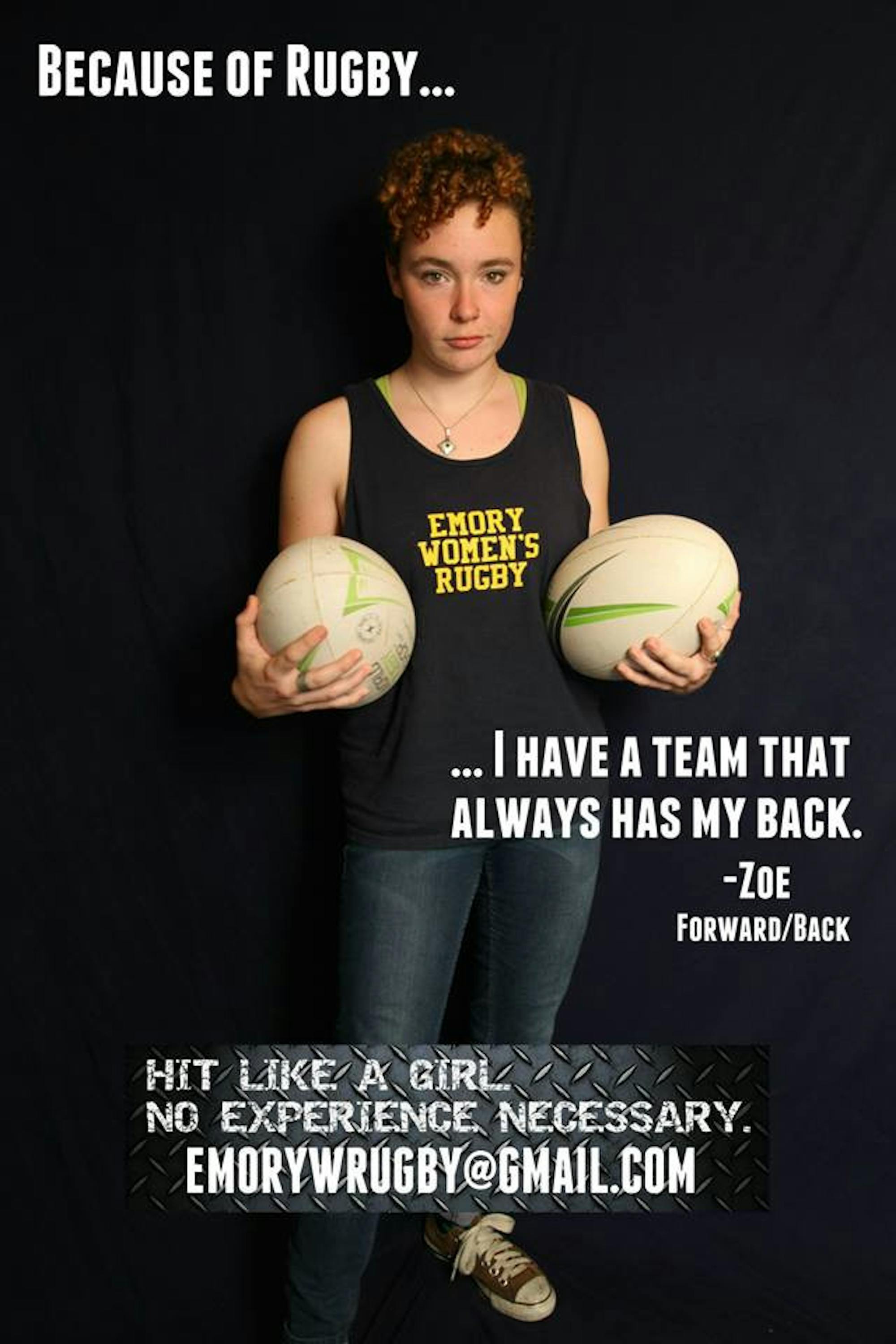 Sophomore Bethany Studnicky pictured in the Emory Women's Rugby Club's "Because of Rugby" campaign. Photo courtesy of Rebecca Han.