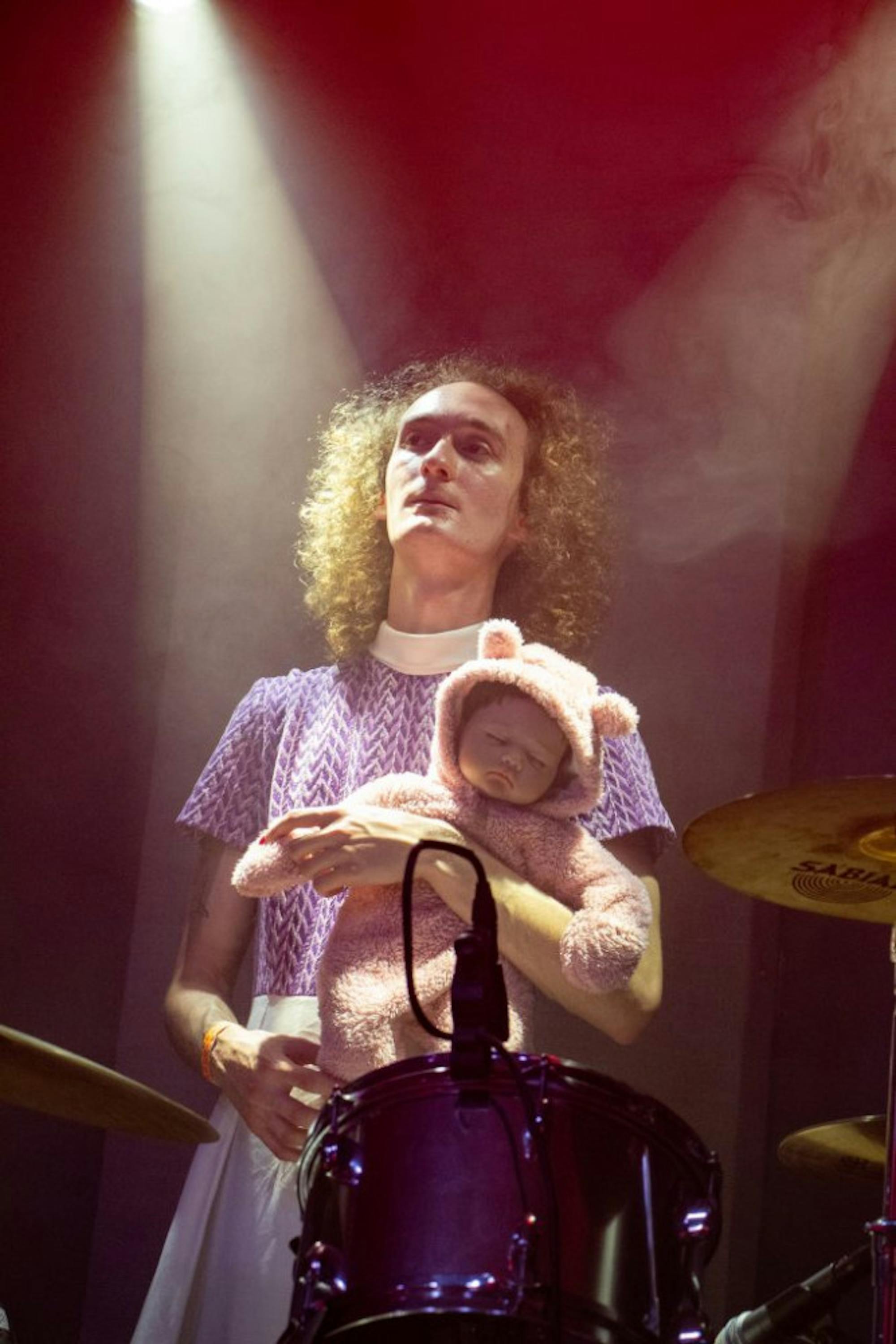 Bassist Henry Pearl (known as “HP”) donned a Minnie Mouse-inspired fit, while Abramovich rocked a mini skirt and held a fake baby (whose name is Geesephine, by the way) in between songs. Weingartner entered the stage wearing a wrestling mask, alongside lead vocalist Jude Ciulla, who rocked a nineties-esque t-shirt and baggy jean combo.