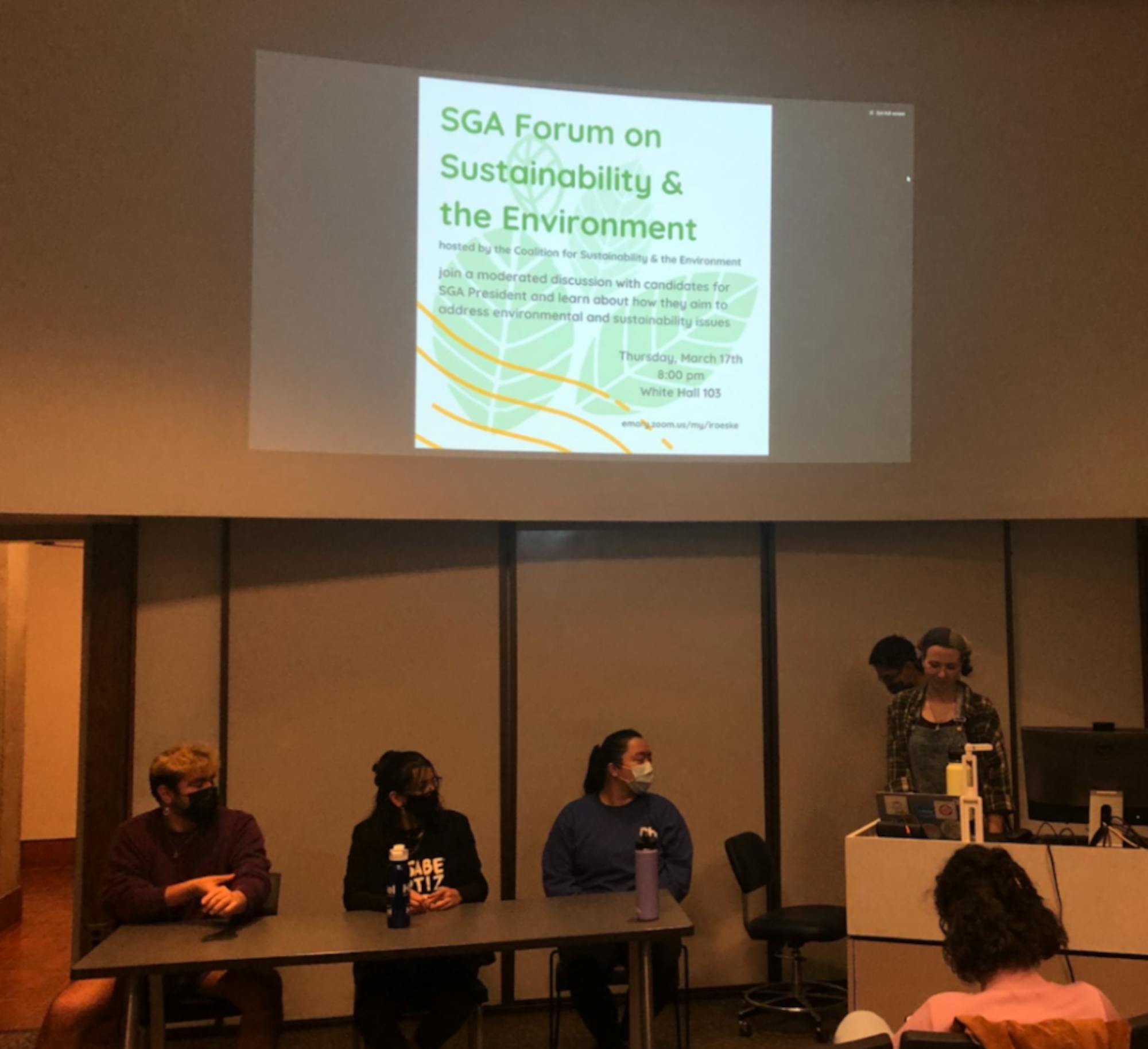 Student Government Association (SGA) presidential and vice presidential candidates answered sustainability-related questions at the inaugural SGA Forum on Sustainability and the Environment on March 17. The forum was hosted by the Coalition for Sustainability and the Environment, which is composed of 13 undergraduate and graduate organizations.