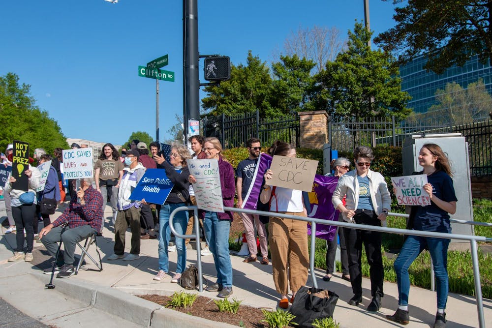 EmoryUnite! members joined other community members for their weekly protest in front of the Centers for Disease Control and Prevention (CDC) headquarters on April 8. The graduate student union invited members and other Emory University students to join the regular demonstration in an Instagram post on April 5. At its peak the protest had about 75 people.