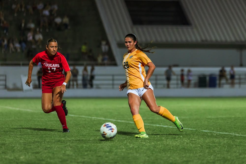 Junior forward Emily Woodall prepares to pass against Columbus State University (Ga.) at the WoodPEC Center on Aug. 29. Madison Schulte Media