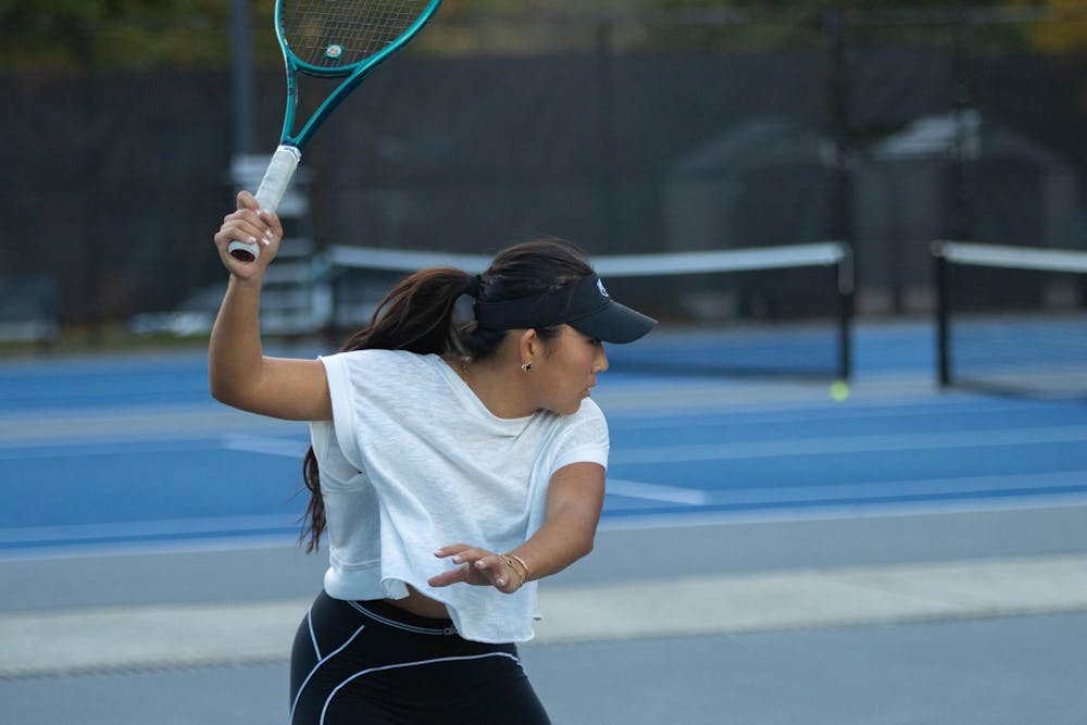 Freshman tennis player Jessy Chen winds up to swing. Emerson Farrar