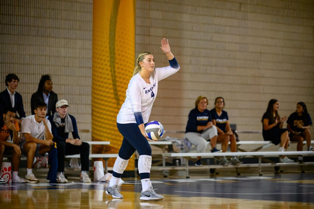 Senior setter Olivia Rabinowitz prepares to serve in a home game. Courtesy of Olivia Rabinowitz